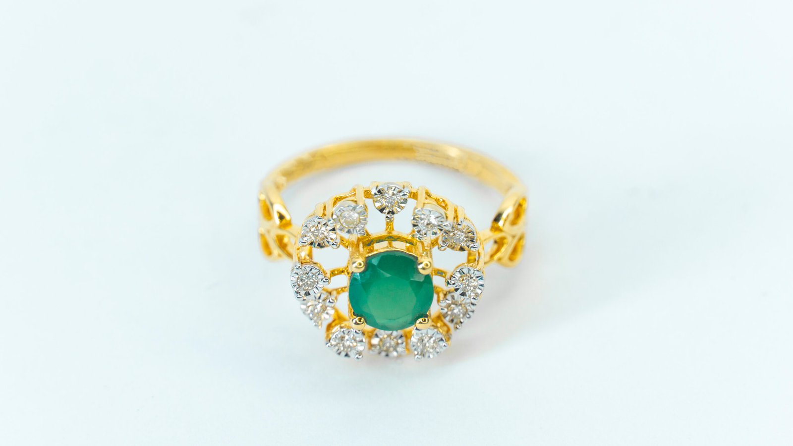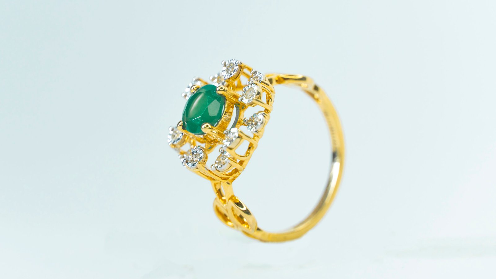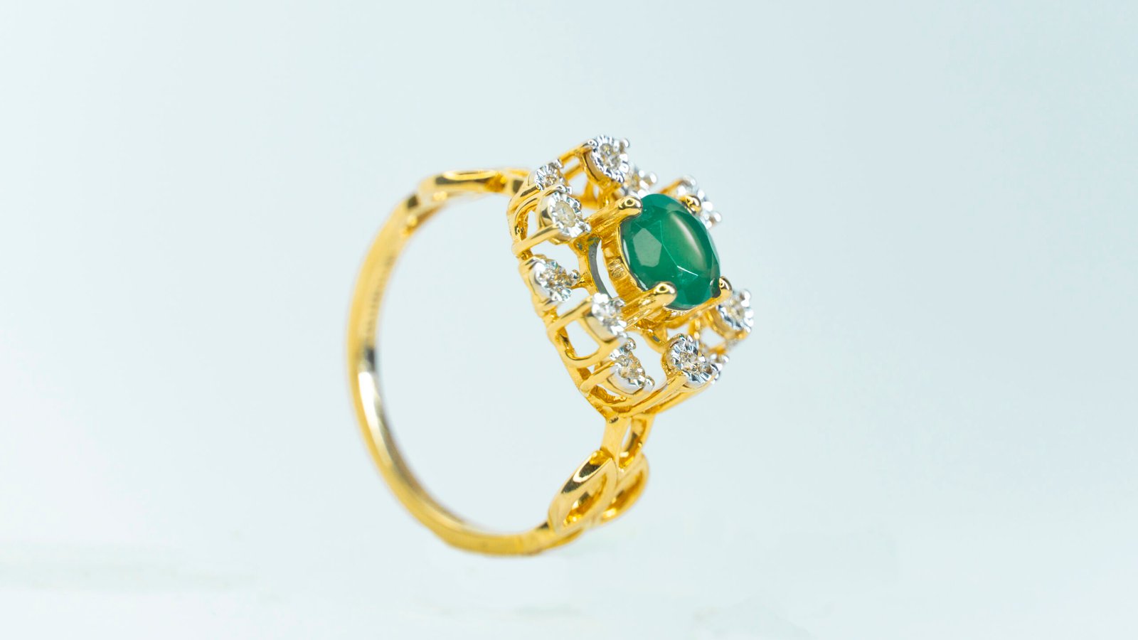 Elevate your jewelry collection with this exquisite Emerald and Diamond Cocktail Ring. Featuring a vibrant, oval-cut green gemstone at its heart, this ring is framed by a unique, architectural “blossom” halo that captures light from every angle. It is the perfect statement piece for those who appreciate sophisticated design and the timeless allure of colored gemstones. Design Details The Center Stone: A deep, forest-green emerald (or high-quality green onyx) oval-cut stone, securely held by four polished gold prongs. The Halo: An intricate, tiered yellow gold cage design featuring eight brilliant-cut white diamonds. This open-work setting allows for maximum light refraction, making the stones appear to float. The Band: A delicate, bypass-style shank with elegant leaf-like cutouts, reinforcing the organic, floral theme of the piece. Material: Crafted in high-polish 14K Yellow Gold for a rich, warm glow that perfectly complements the green center stone. Key Features Vintage-Inspired Modernity: Combines the regal look of a traditional halo with a modern, structural silhouette. Versatile Statement: Bold enough for formal events, yet elegant enough for daily luxury wear. Gift-Ready: An ideal choice for May birthdays (emerald birthstone), anniversaries, or a special “treat yourself” moment.